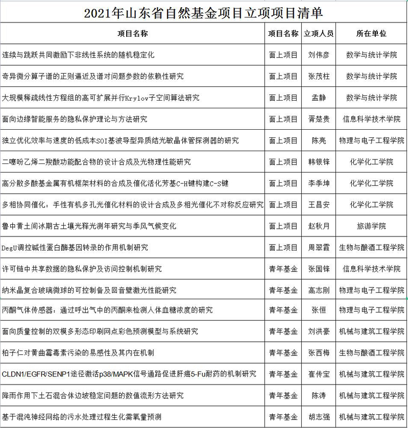 近日,山东省科学技术厅公布了2021年度山东省自然基金立项名单,我校有18项基金获批立项,其中10项面上项目、8项青年项目,在省内同类院校中名列前茅。具体立项名单如下: