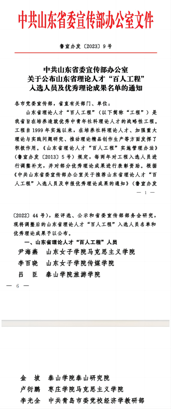 在新一轮山东省理论人才“百人工程”评选中,我校吕臣、金坡两位教授成功入选,实现了学校入选人数新的突破,在省内同类院校中居于前列。