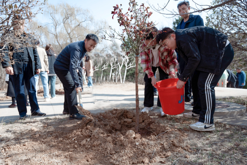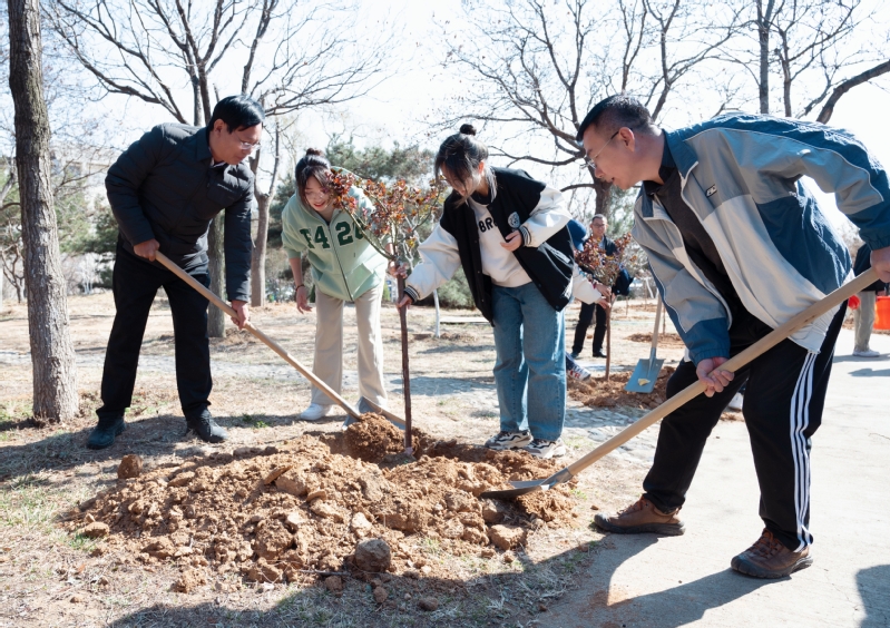 学校领导与师生拿着铁锹、锄头,万里图书馆东侧路两旁的树苗种植区,几人一组,铲土、扶苗、踩土压实、拎桶浇水,分工明确、配合默契。在植树过程中,他们相互交流植树经验,悉心种下一棵棵树苗,还不时向工作人员询问树苗的品种、生长周期等情况。忙碌后,一株株苗木错落有致、迎风挺立,呈现一片绿意盎然的景象。